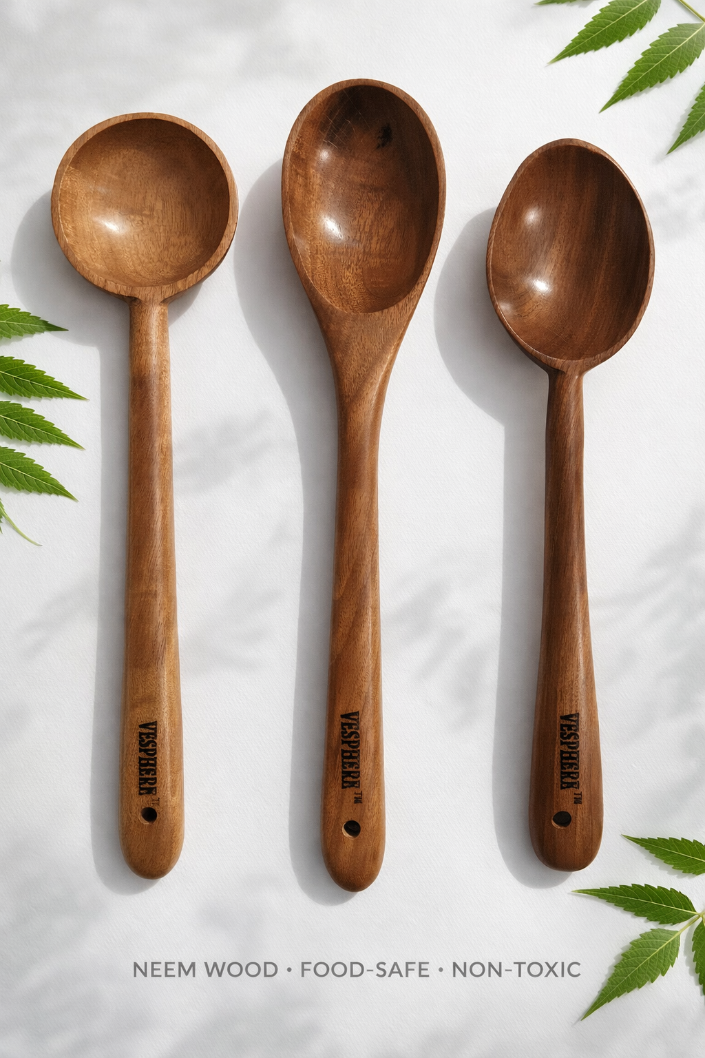 VESPHERE Neem Wood Ladle & Spoon Set includes 1 ladle and 2 spoons made from 100% natural, food-safe neem wood. Durable, antibacterial, heat resistant, and gentle on non-stick cookware—perfect for everyday healthy cooking.