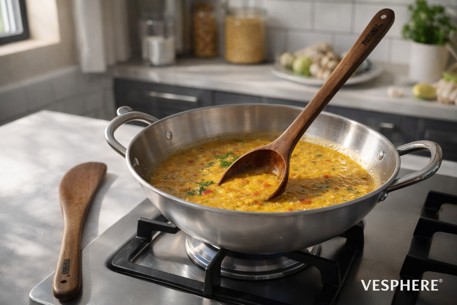 VESPHERE Neem Wood Turner & Ladle Set is crafted from 100% natural neem wood, offering a safe, eco-friendly, and durable solution for everyday cooking. Naturally antibacterial and gentle on non-stick cookware, this hand-polished wooden utensil set is ideal for stirring, frying, and serving Indian dishes. Plastic-free, heat-resistant, and perfect for sustainable kitchens.