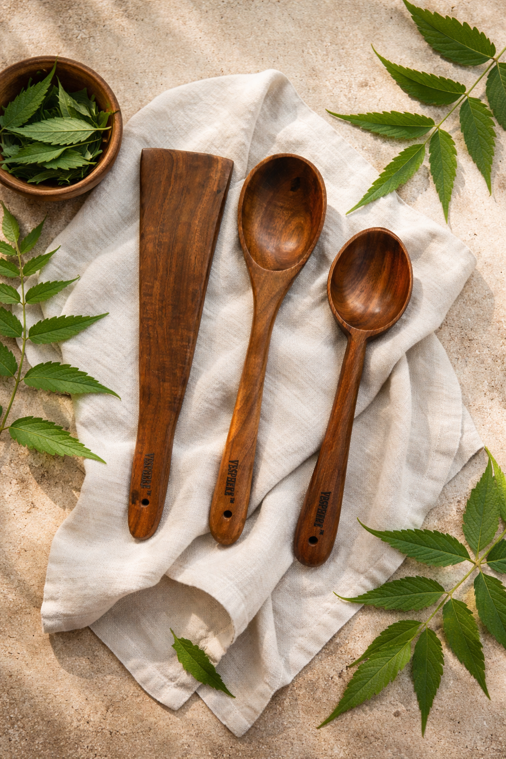 Upgrade your kitchen with the VESPHERE Neem Wood Cooking Tool Set, thoughtfully crafted for healthy, sustainable, and everyday cooking. This premium set includes 1 Wide Spatula and 2 Spoons, made from 100% natural neem wood, known for its antibacterial properties and long-lasting durability.