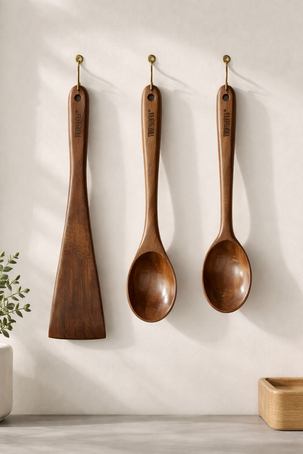 VESPHERE Neem Wood Wide Spatula & Spoon Set includes 1 wide spatula and 2 spoons, crafted from 100% natural neem wood. Antibacterial, eco-friendly, and safe for non-stick cookware, this durable utensil set is ideal for everyday Indian cooking.