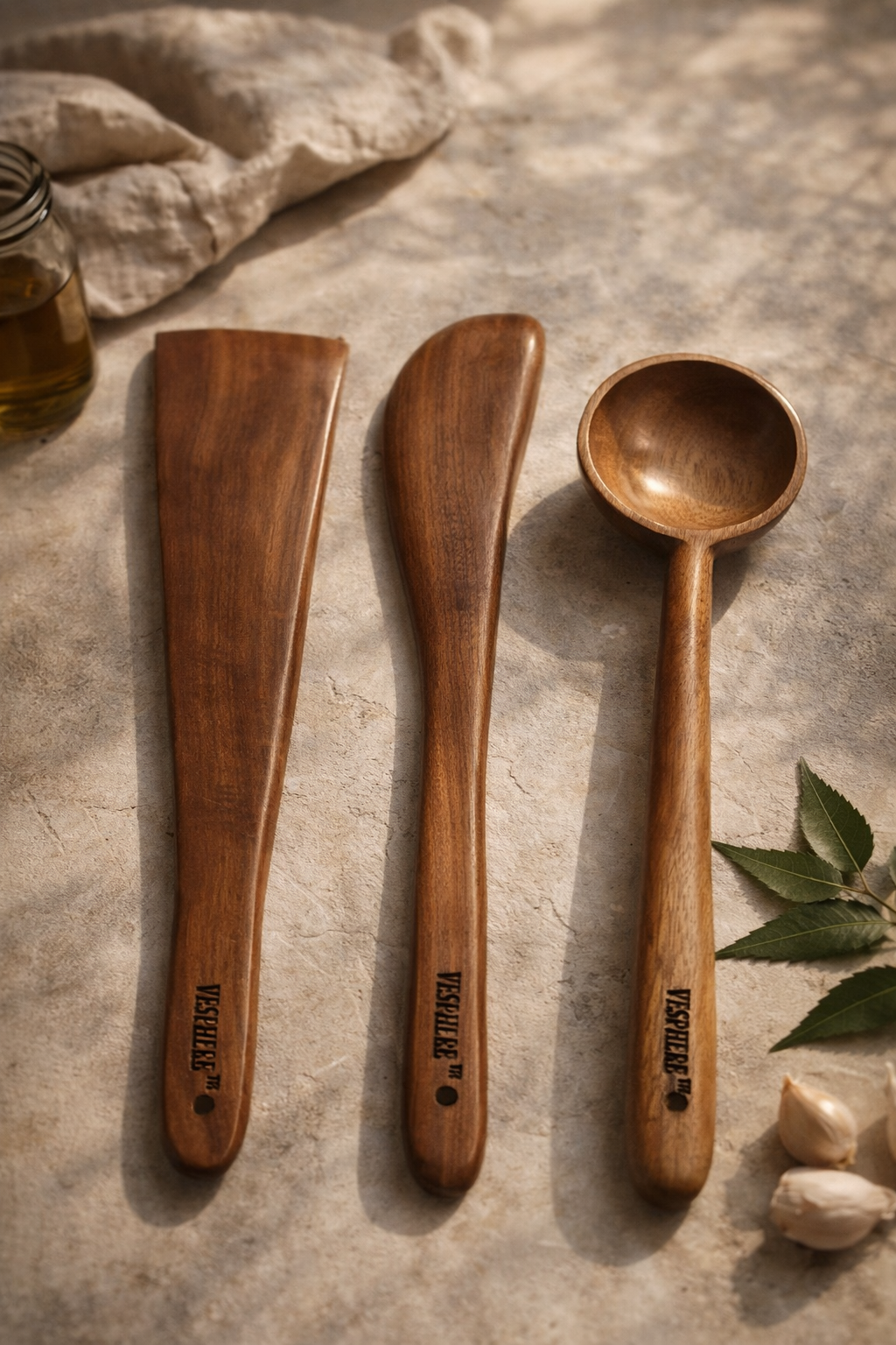 Upgrade your kitchen with the VESPHERE Neem Wood Wide Spatula, Turner & Ladle Set, crafted for healthy, stylish, and efficient cooking. Made from 100% natural neem wood, this premium kitchen utensil set is eco-friendly, durable, and safe for everyday use. Neem wood is naturally antibacterial, making it an excellent choice for hygienic food preparation.