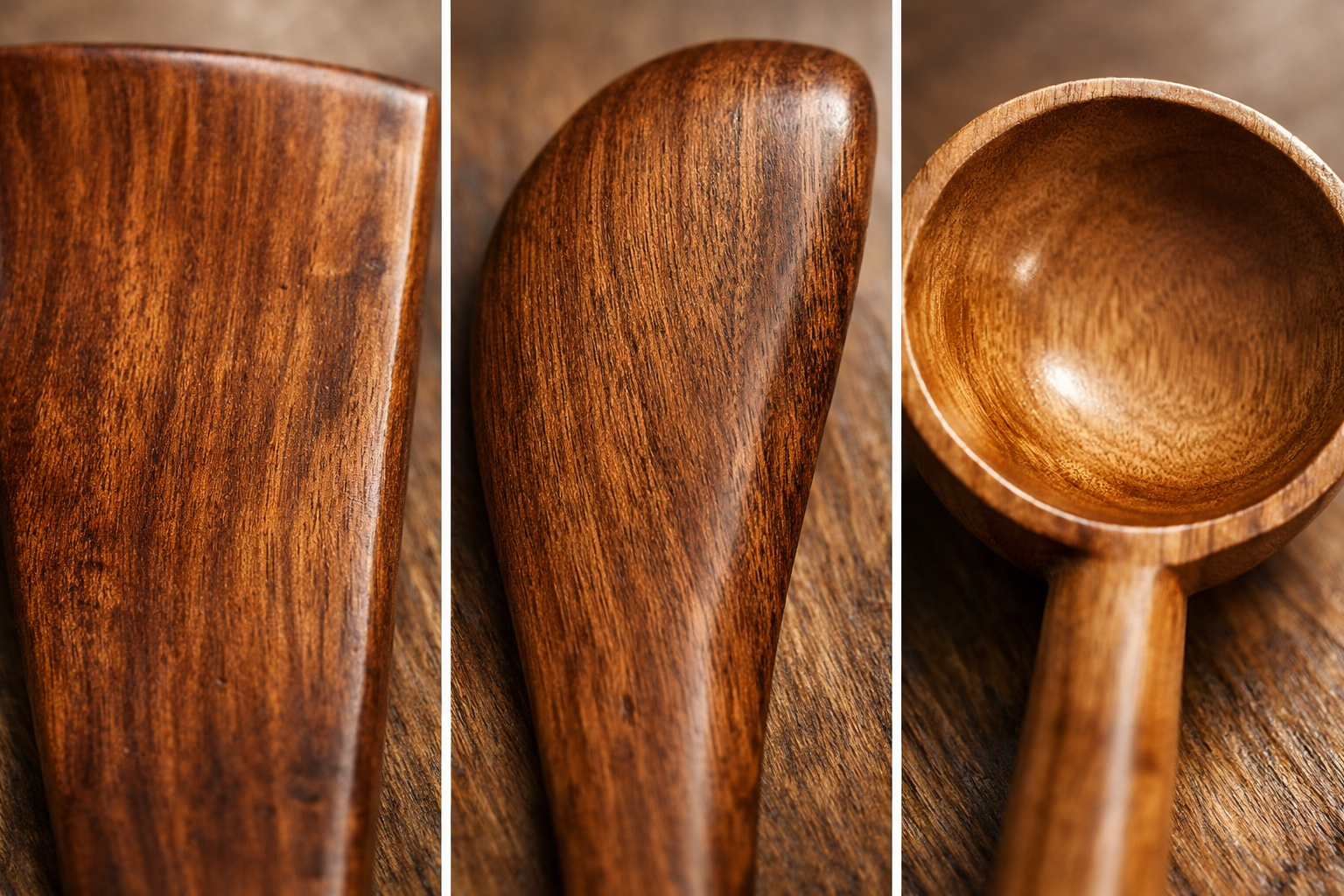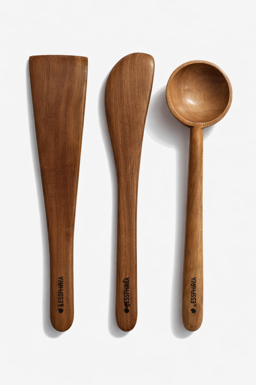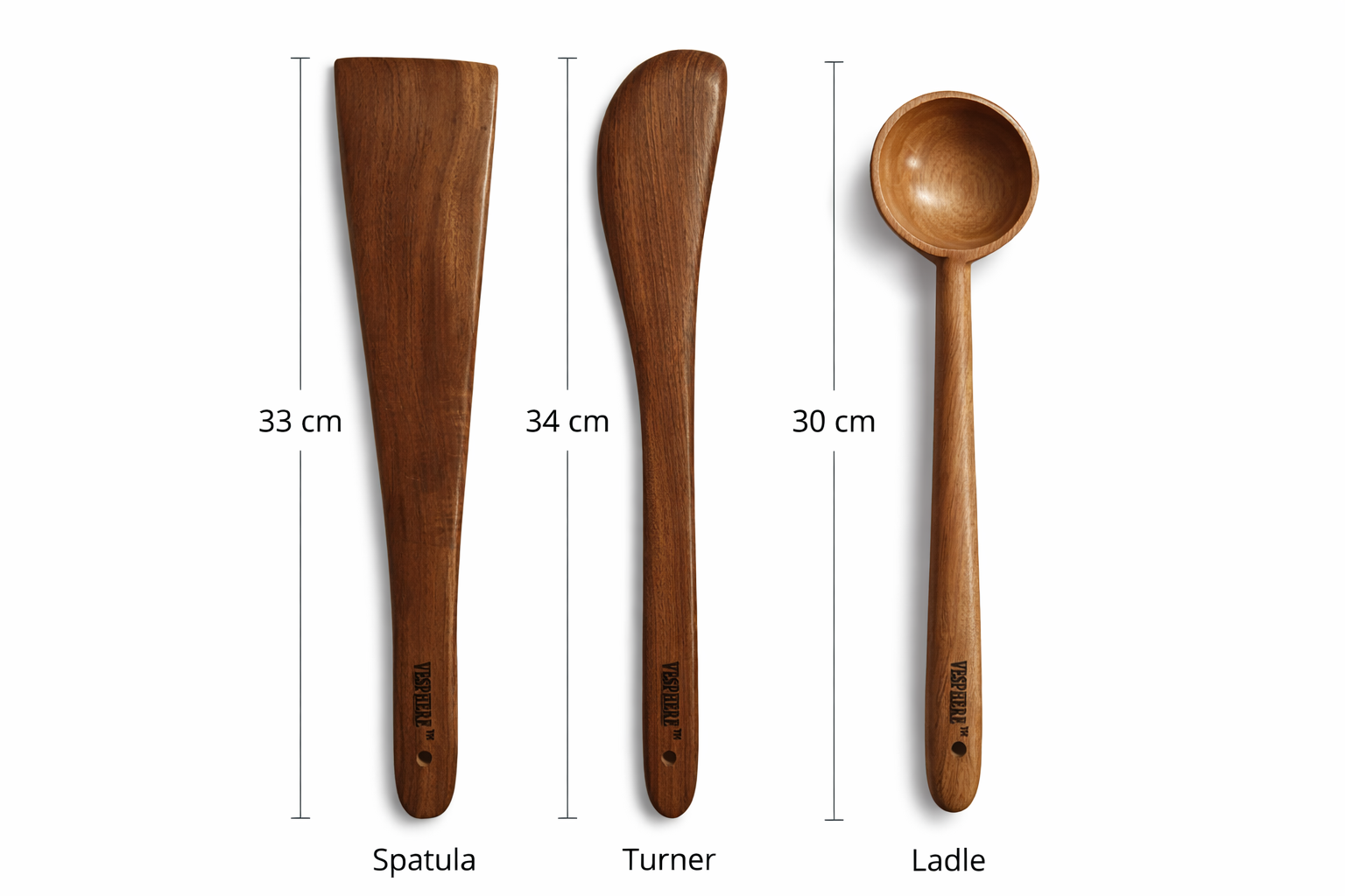 Designed with smooth, well-balanced handles, each utensil offers a comfortable grip and precise control while cooking. The spatula is perfect for sautéing and stirring, the turner helps flip rotis, dosas, and vegetables with ease, and the ladle is ideal for serving curries, dal, and soups. The wooden finish protects your non-stick cookware from scratches and extends its lifespan.